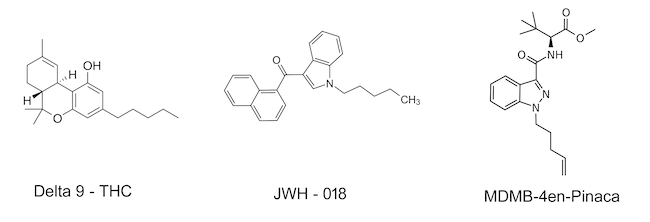 Beim Erscheinen auf dem Markt waren kaum gesetzliche Regelungen vorhanden.Neben anderen Substanzen wurden SC unter der Bezeichnung “Legal Highs” verkauft. Es bildete sich schnell ein schwungvoller Handel, ausgehend von chinesischen Produzenten. Innovativ werden einzelne chemische Funktionsgruppen variiert, um neue Substanzen mit wechselnden erwünschten (und unerwünschten) Wirkungen auf den Markt zu bringen. Die SC wurden in der Folge je nach Substanz und Land entweder als Suchtmittel/Betäubungsmittel und/oder als “Neue Psychotrope Substanzen - NPS” kategorisiert. Entsprechend wurden Gesetze erlassen, wodurch ganze Stoffgruppen und nicht nur einzelne Substanzen reguliert werden konnten. In ihrer Struktur unterscheiden sich die SC stark von den natürlichen Cannabinoiden und auch den SSC und sind bei der Analyse gut voneinander zu trennen. In Europa wurden schon mehrere Hundert SC im Markt gesehen. Labors von Sicherheitsbehörden haben eigene Task Forces zur Identifizierung von SC ins Leben gerufen. Wir listen hier lediglich 3 Vertreter der SC auf, da sich Chemie, Markt und Konsumenten dieser Substanzklasse mit den anderen vier Kategorien nur bedingt überschneiden. Chemische Strukturen von d9-THC vs JW-H018 vs MDMB-4en-PINACA